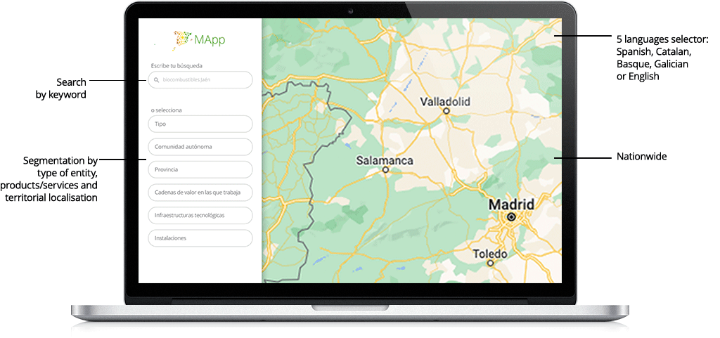 Any entity can be part of MApp and it is also publicly accessible and any anonymous user can use it to carry out searches for entities in the biocircular economy area and find the public-private agents that go to make up the national biocircularity sector.